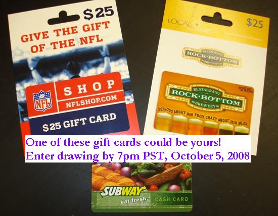 Wowza, Subway was the unanimous choice; absolutely no takers for the NFLShop.com and Rock Bottom Brewery!! It was a guy friend who persuaded me to have the NFLShop.com gift card as one of the prize options. He was convinced there’d be lots of sports fans clamoring over it. I’ll have to break it to him he was wrong. LOL. I think this pretty much rules out offering sports gift cards as prizes in the future.