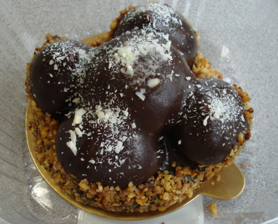 Chocolate cake topped with a mountain of chocolate mousse and covered in ganache