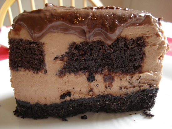 Chocolate cheesecake on chocolate crust with a fudgy brownie/cake topped with chocolate frosting