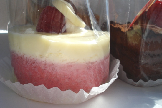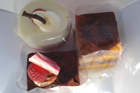 Clockwise from top left: Mistral (made with raspberry and white chocolate), Caramel Mousse (sugar with heavy cream), Mousse Chocolat (semi-sweet chocolate)