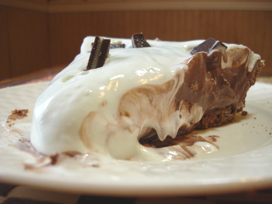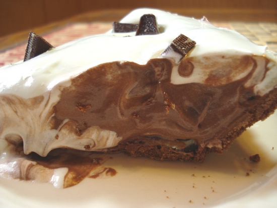 Chocolate crust, chocolate pudding with mint chocolates, topped with Cool Whip and more mint chocolates