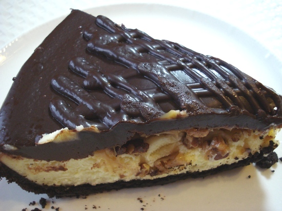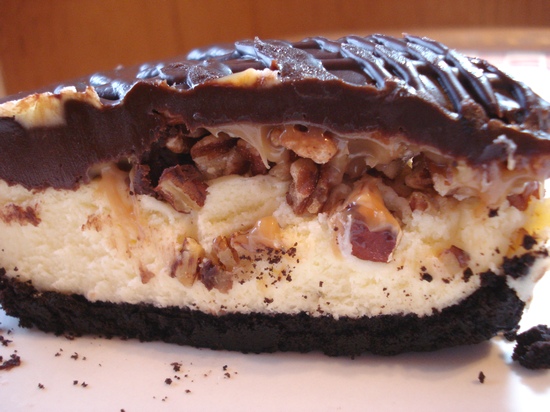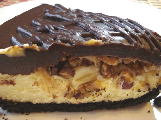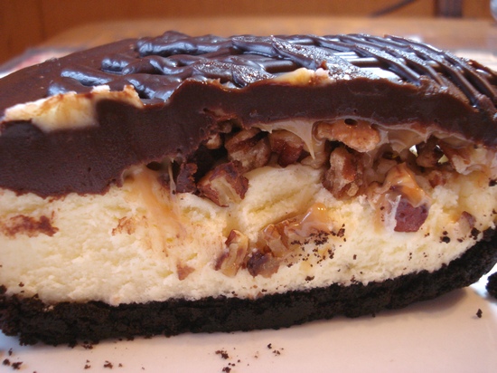 Chocolate pie crust, cheesecake, laced with caramel and chopped walnuts, and topped with chocolate