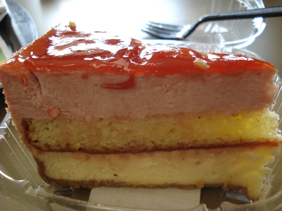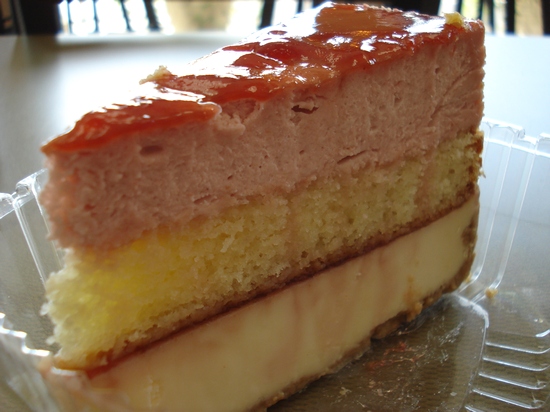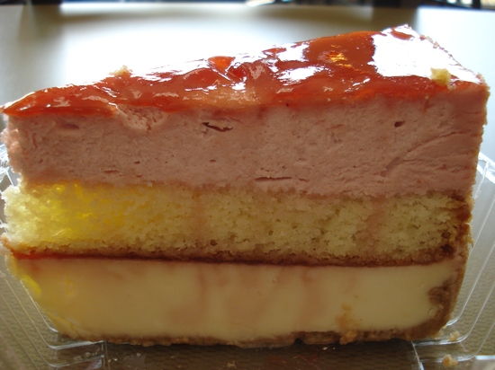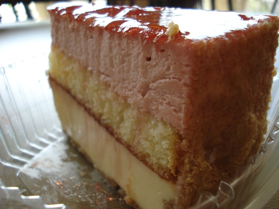 This 3-layer dream of strawberry mousse, white cake, and cheesecake was exquisite