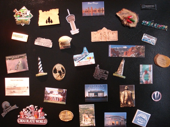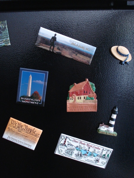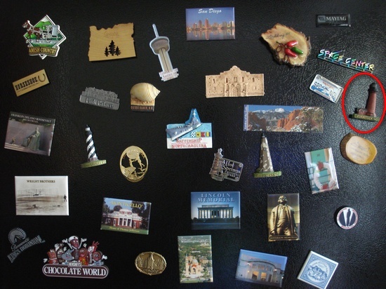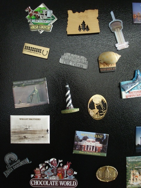From top: Amish Country (Lancaster, Pennsylvania); Oregon (bought from mall in Portland); Tower of the Americas (San Antonio); Horseshoe Casino (Tunica, Mississippi); Pink Palace (Memphis, Tennessee); Outer Banks, North Carolina; Franklin Delano Roosevelt Memorial (Washington D.C.); Cape Hatteras Lighthouse (North Carolina); The Blowing Rock (Blowing Rock, North Carolina); Wright Brothers National Memorial (Kill Devil Hills, North Carolina); Monticello (Charlottesville, Virginia); Kings Dominion (Doswell, Virginia); Hershey’s Chocolate World (Hershey, Pennsylvania); Biltmore (Asheville, North Carolina)
