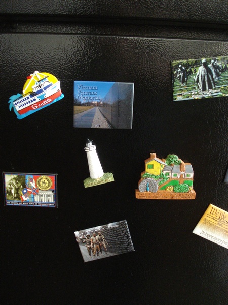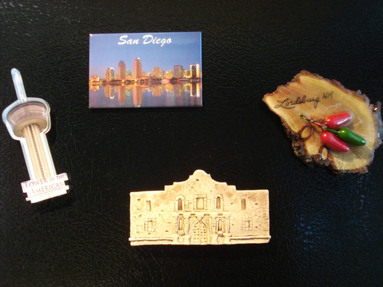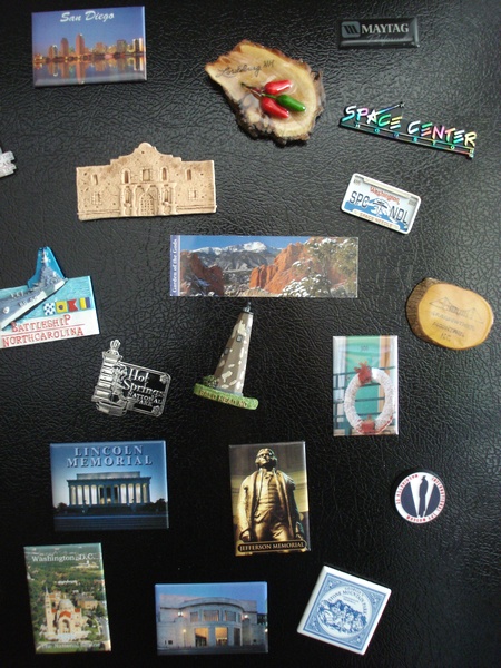 In the few weeks of being together, we’ve already experienced some distressing moments. ‘Twas during our road trip out west to pick up my belongings from two separate storage units. I’ll just say there were several surprises along the way, like having to rent an additional mini van (I swear I didn’t think I had that much stuff, LOL), getting locked-in the 2nd storage unit complex, and the terrifying minutes we were caught in a dust storm while driving on an interstate. I will be posting the gory details and pics of our road trip adventure very soon, but lemme start with the very first thing I unpacked once we got back home: my magnet collection since 1999! Woohoo! After being stored in cookie tins for a few years (most of ’em, anyway), they’re all now beaming on our fridge.