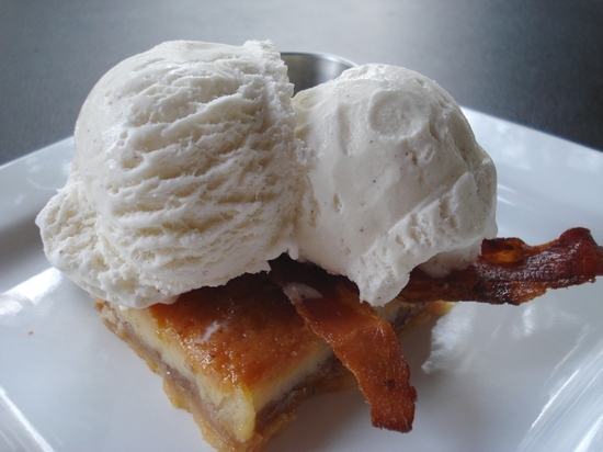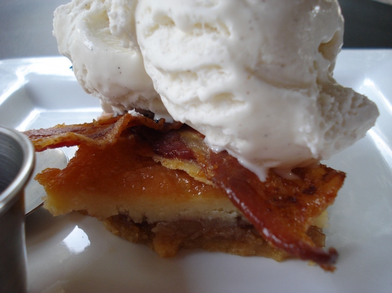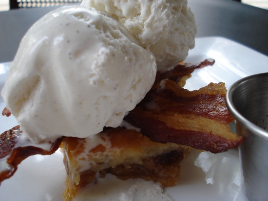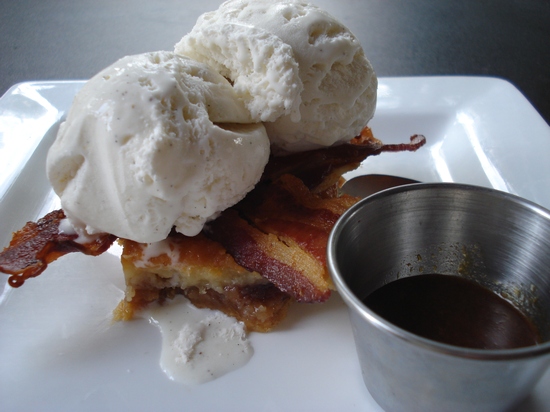 Topped with strips of maple bacon (yes, baaaaaaacon!) and 2 scoops of vanilla bean ice cream!