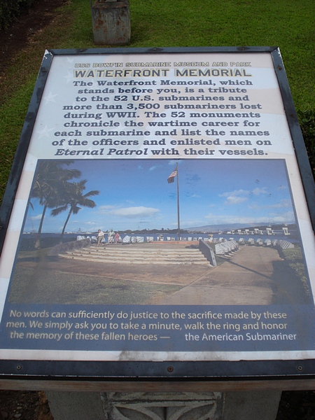 The Waterfront Memorial is a “tribute to the 52 U.S. submarines and more than 3,500 submariners lost during WWII”…