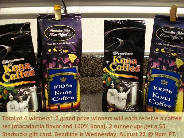 There will be 4 winners (2 grand prize + 2 runner-ups). The two grand prize winners each get one 100% Kona Coffee and one Macadamia Flavor coffee grounds. The 2 runner-ups will each receive my consolation prize of a $5 Starbucks gift card.