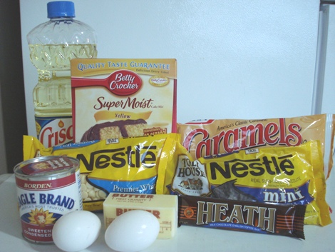 This recipe was my contribution for a potluck party yesterday. I hadn’t baked in a month, and had my heart set on making this after my hiatus, LOL. I bought all the ingredients last Wednesday. Maybe going to 3 stores to find a Heath bar should have been my clue that I was gonna be put through the wringer. I made this Saturday night and it was a near-disaster. First off, opening 32 caramel wrappers is NOT my idea of fun. 10, 16 maybe, but 32? It got tedious after 20.