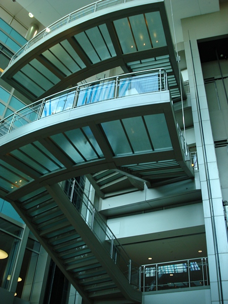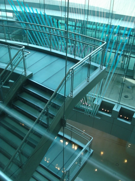 On the 1st floor looking upward (at the 3rd & 4th floor left-side staircase landings)